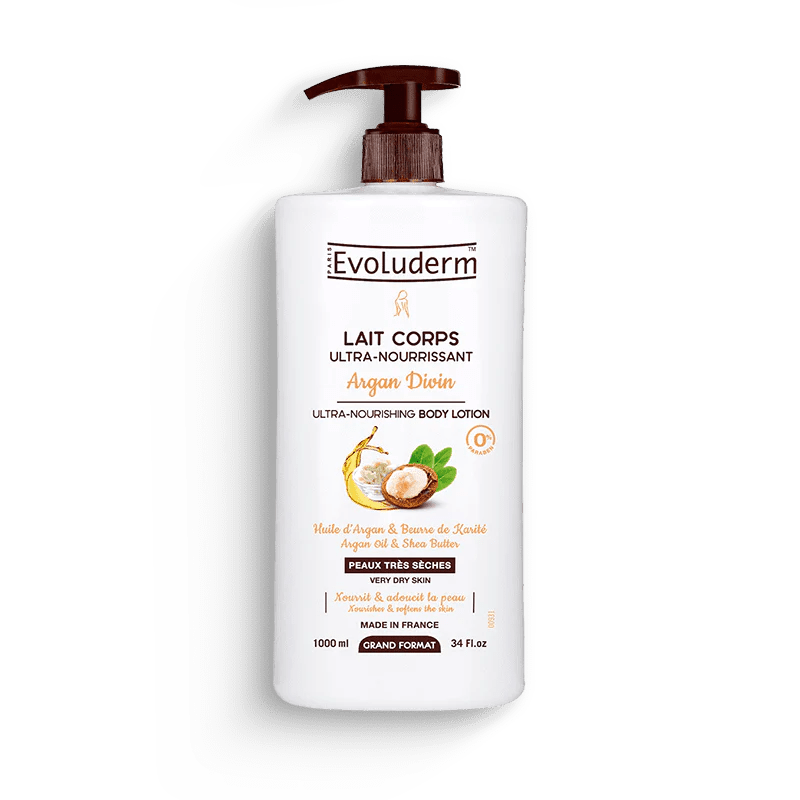Evoluderm Divine Argan Ultra-Nourishing Body Milk 1L is formulated with pure Argan Oil and Shea Butter to provide long-lasting hydration and deep nourishment. This rich, non-greasy formula absorbs quickly, restoring skin softness and radiance. Ideal for dry, sensitive, and dehydrated skin, it protects against dryness while enhancing skin elasticity