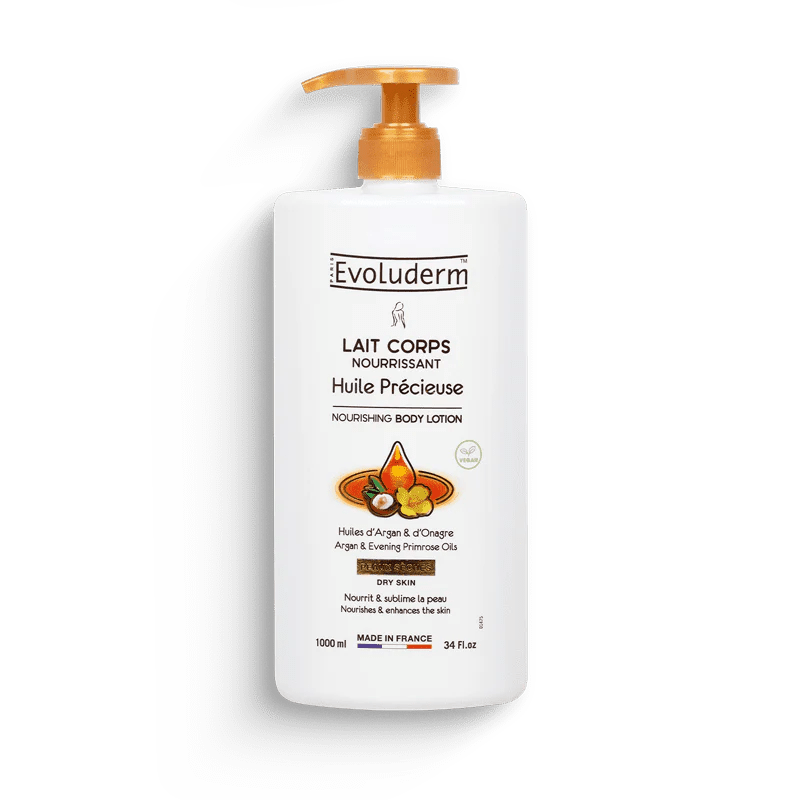 Evoluderm Ultra-Nourishing Body Milk Precious Oil 1Ltr. Formulated with nourishing precious oils, this body milk deeply hydrates, repairs, and revitalizes your skin, leaving it silky smooth and radiant. Ideal for all skin types
